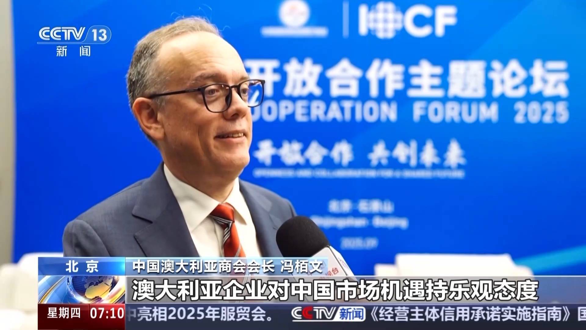 中国澳大利亚商会会长 冯栢文:澳大利亚企业对中国市场机遇持乐观态度。我们最新调查显示,70%的受访企业将中国列为未来三年投资计划的首选市场或三大重点市场之一。