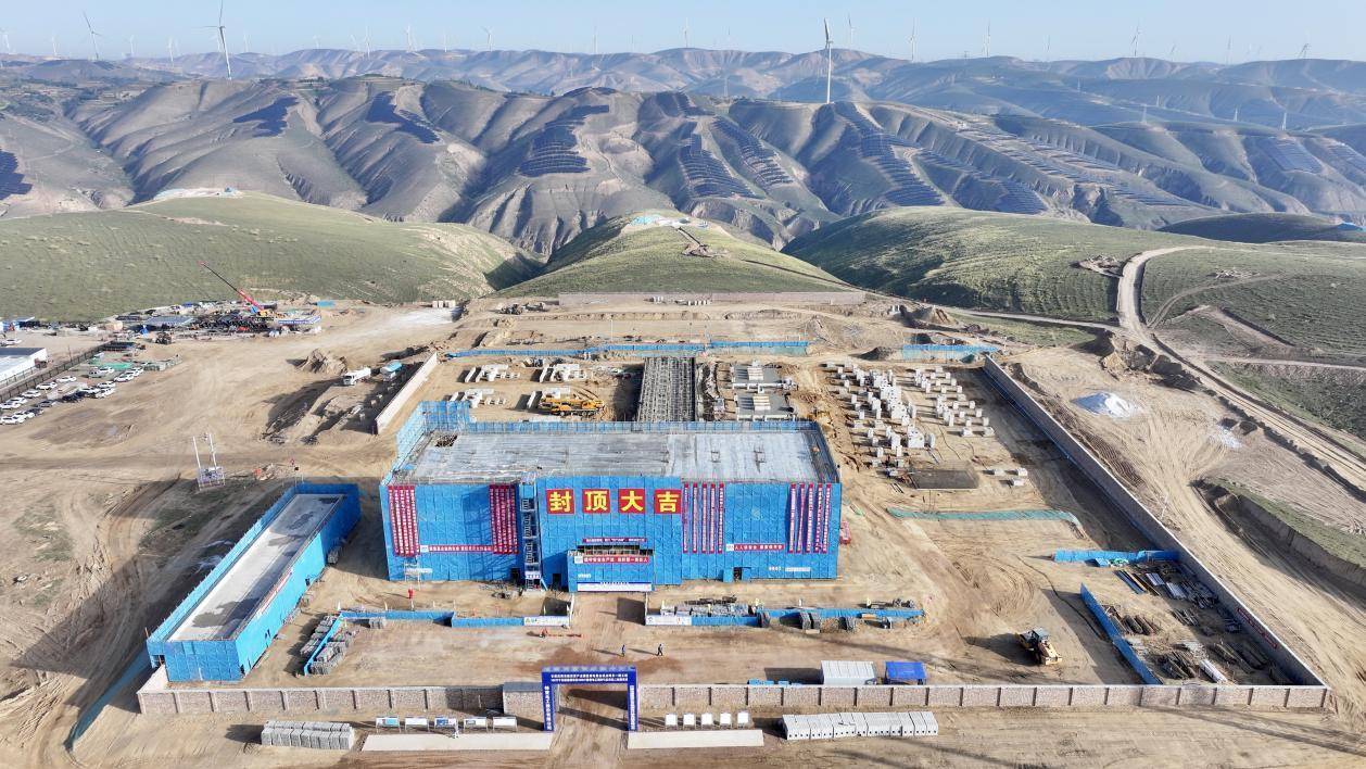 甘肃电投集团庆阳“绿电聚合”试点项目2号升压站综合楼主体结构顺利封顶。雷强摄